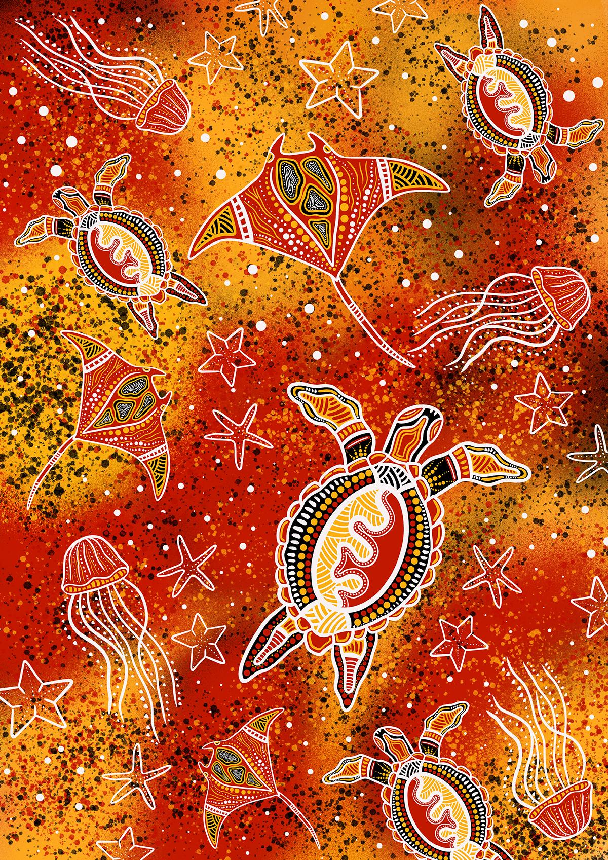 As you can see I have placed a stingray,turtle, jellyfish and starfish. This to represent our beautiful sea animals and their uniqueness. Showing how all our animals are connected yet so very different and beautiful in their own way. The background of the artwork was to represent the Aboriginal Flag colours showing the strong cultural connection mob have with Animals.
