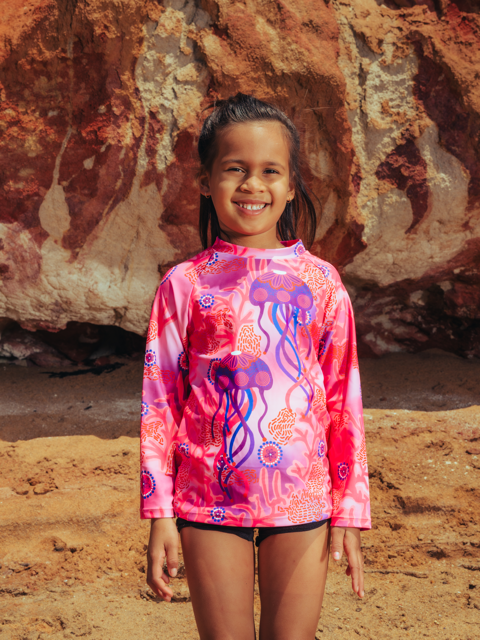 I chose to feature jellyfish in this design because they’ve always been part of my childhood memories, spotting them while swimming at the beach with friends, or finding them along the shore and in rock pools during family camping trips on the NSW coast. I used bright pinks, purples, oranges and blues to capture the thrill of seeing a colourful jellyfish and to evoke that same rush of excitement you feel splashing in the waves as a kid. Surrounded by vibrant coral and meeting place symbols, this piece celebrates the importance of imagination and curiosity.